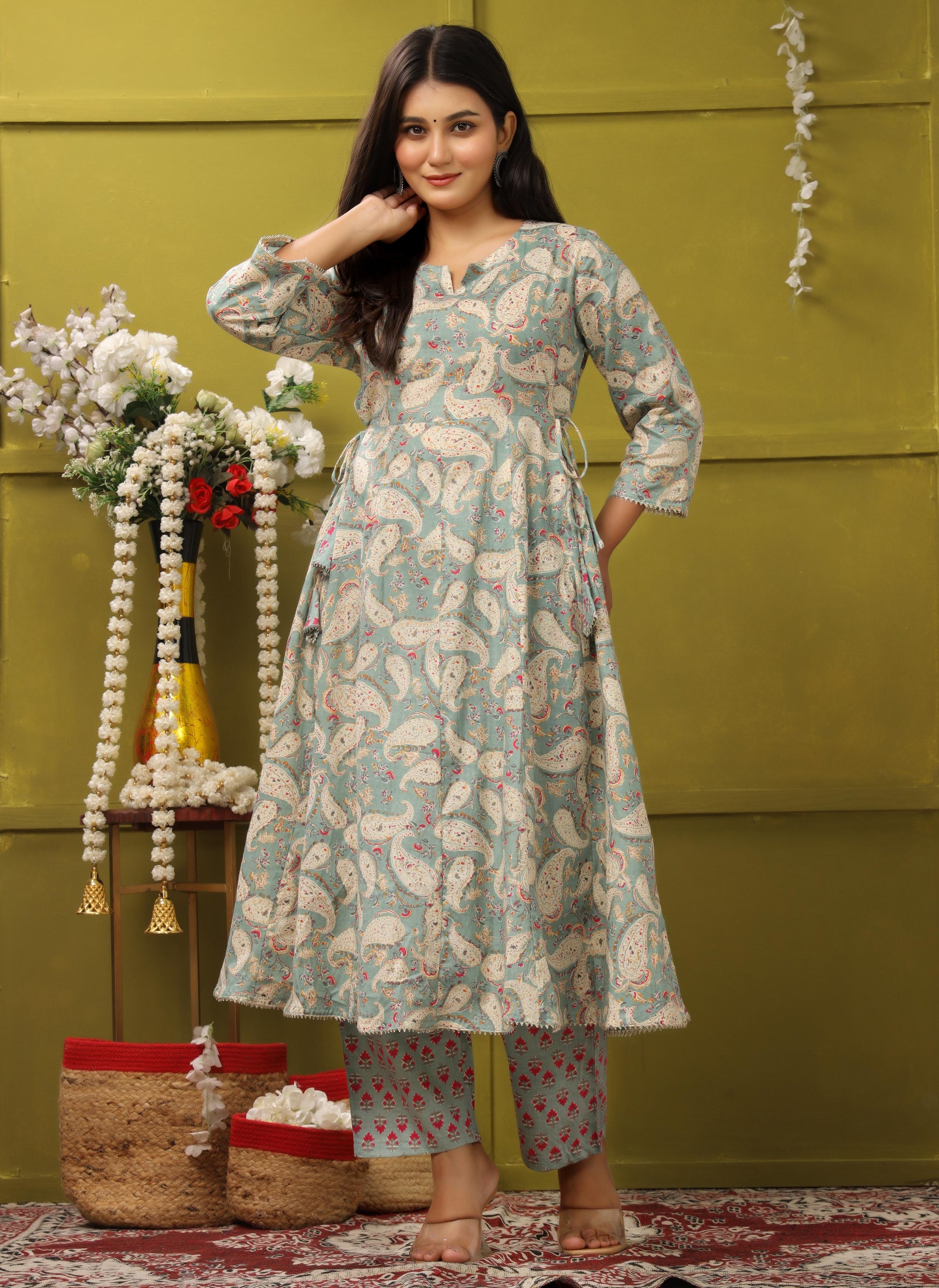 The Anarkali kurta is crafted from lightweight, breathable pure cotton fabric, draping gracefully to create a voluminous flare that flows with every step. It features a sophisticated light blue-green base adorned with an elegant paisley print in shades of white, pink, and brown. The angrakha-style neckline, with its side-tie detailing and delicate tassels, adds a charming touch.
